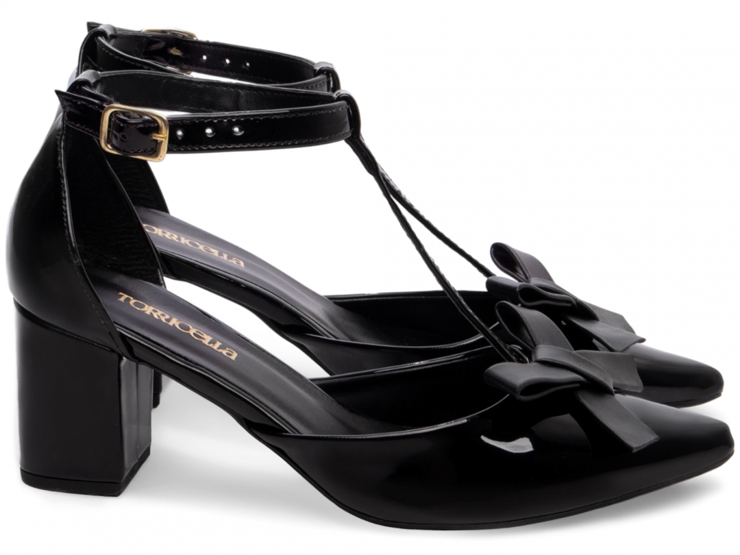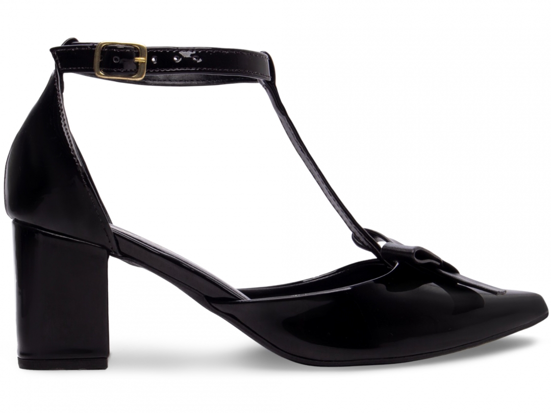 Salto: Grosso com 6,5 cm de Altura Revestido em Verniz Preto;