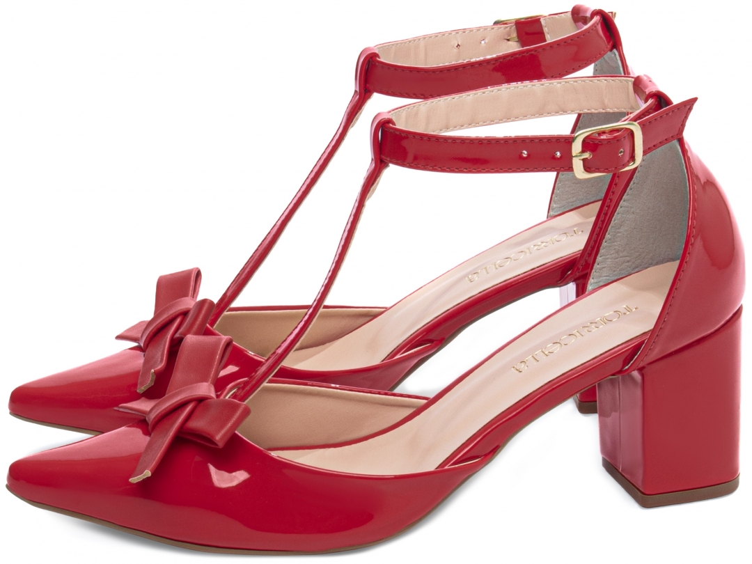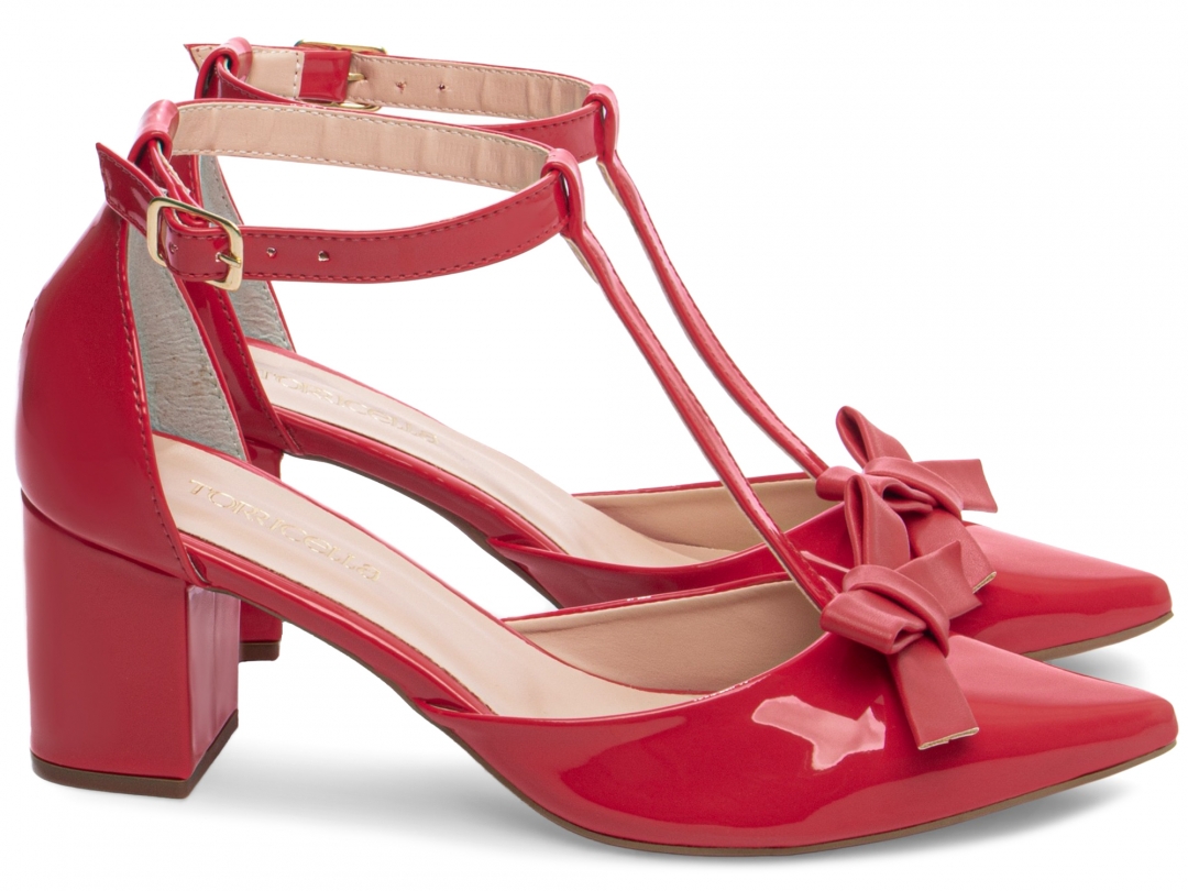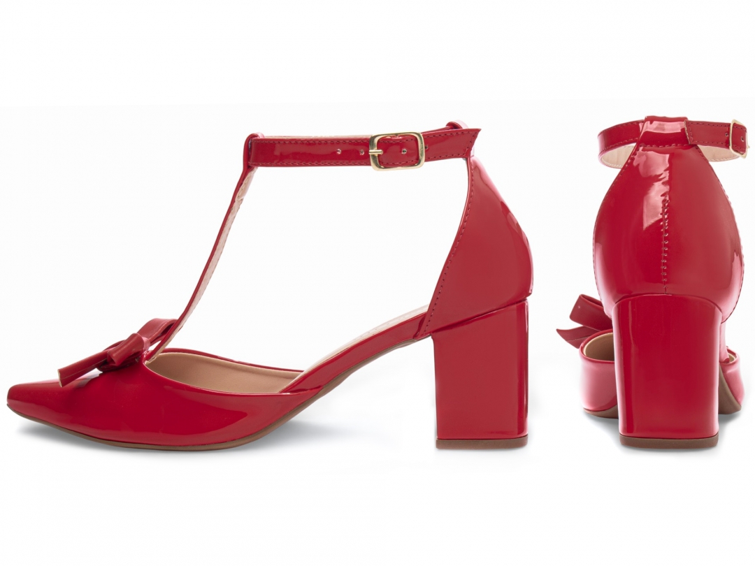 Salto: Grosso com 6,5 cm de Altura Revestido em Verniz Vermelho;