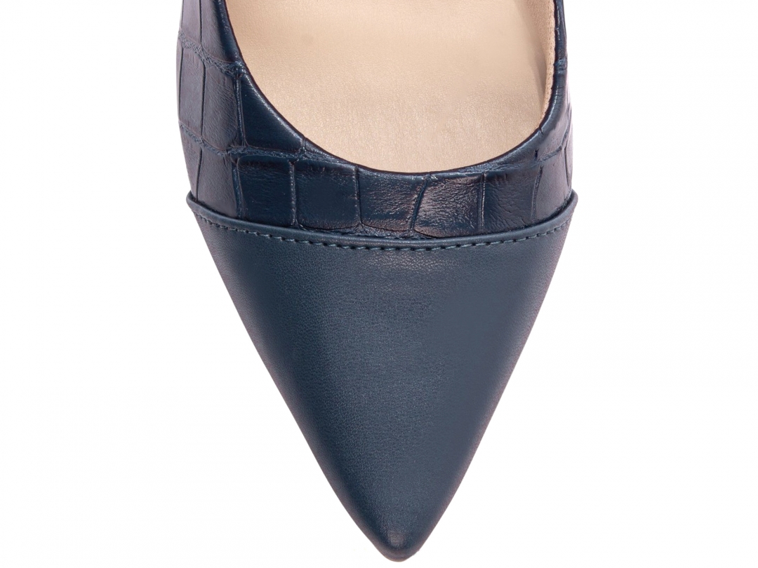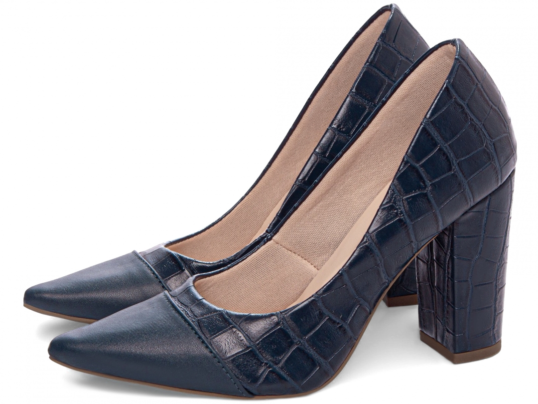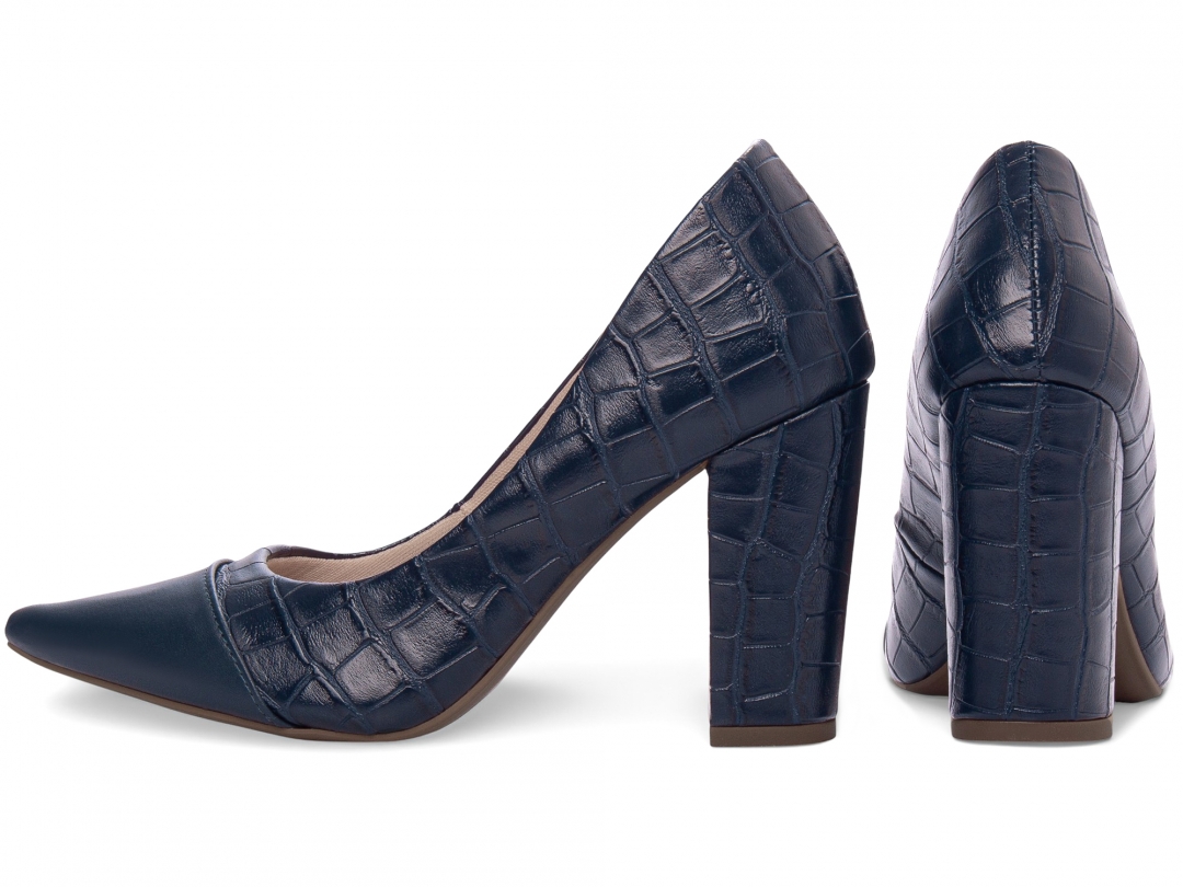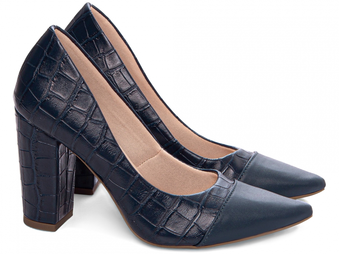 Salto: Grosso com 9 cm de Altura Revestido em Croco Azul Marinho;