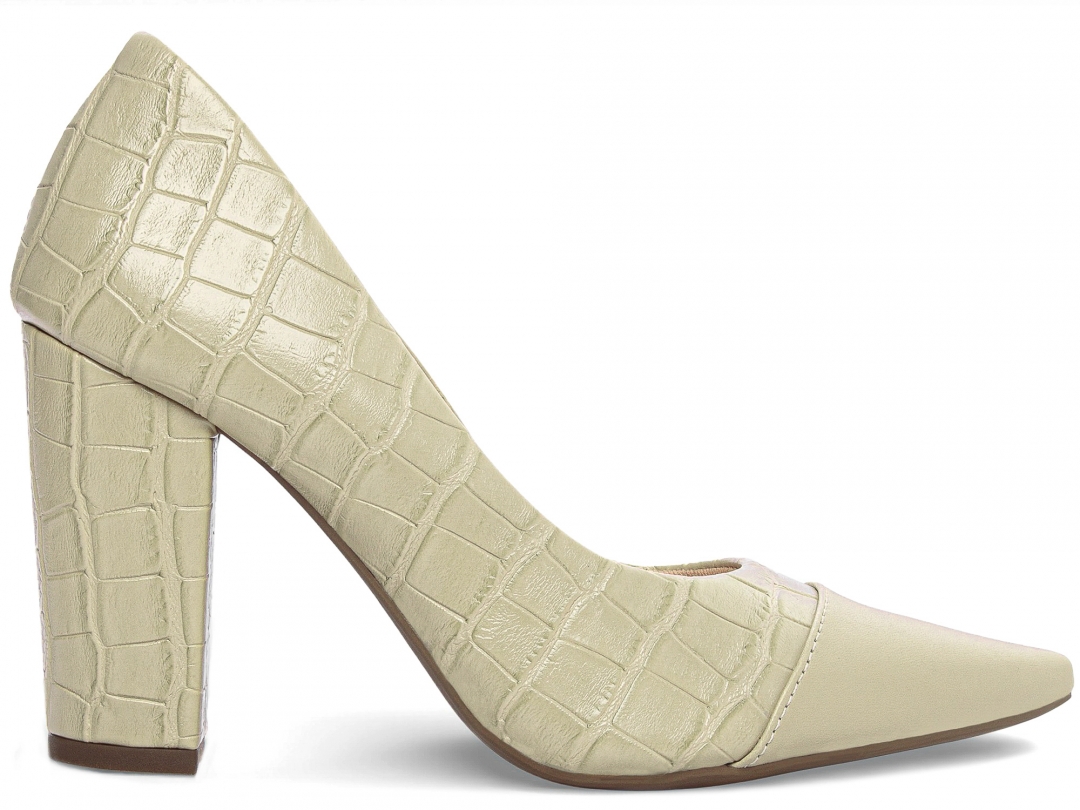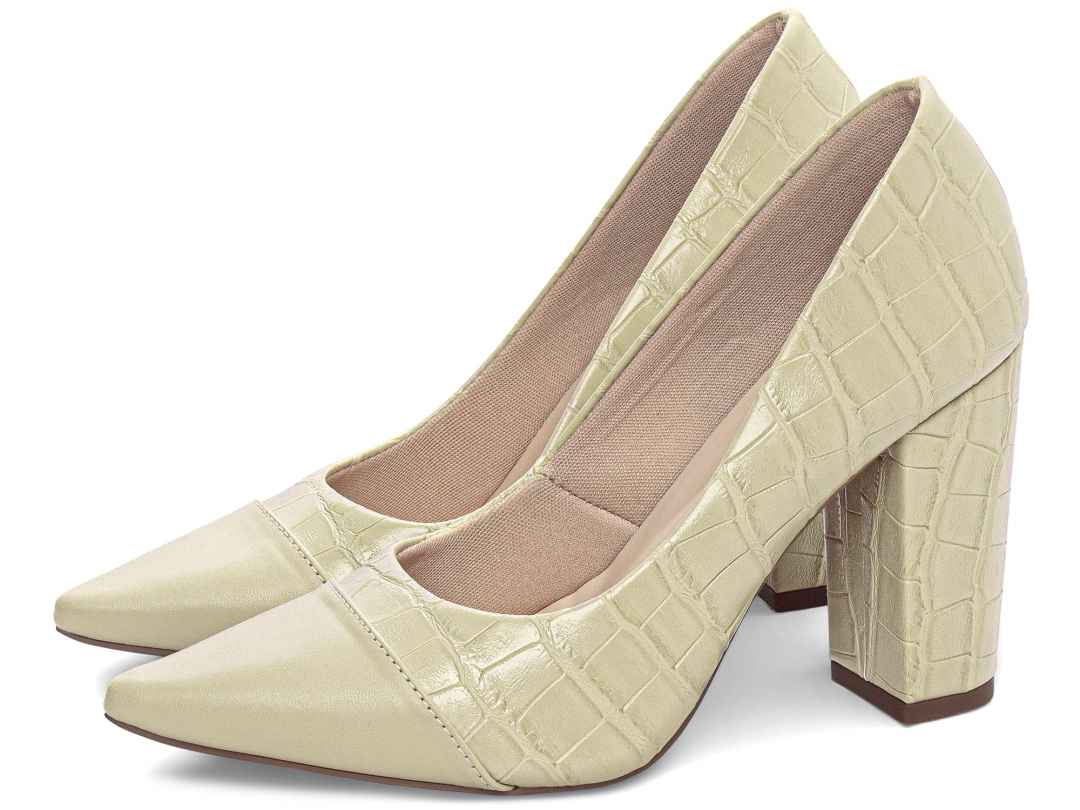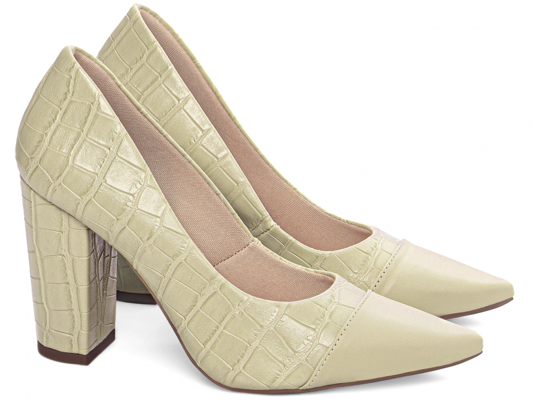 Salto: Grosso com 9 cm de Altura Revestido em Croco Verde Pistache Claro;