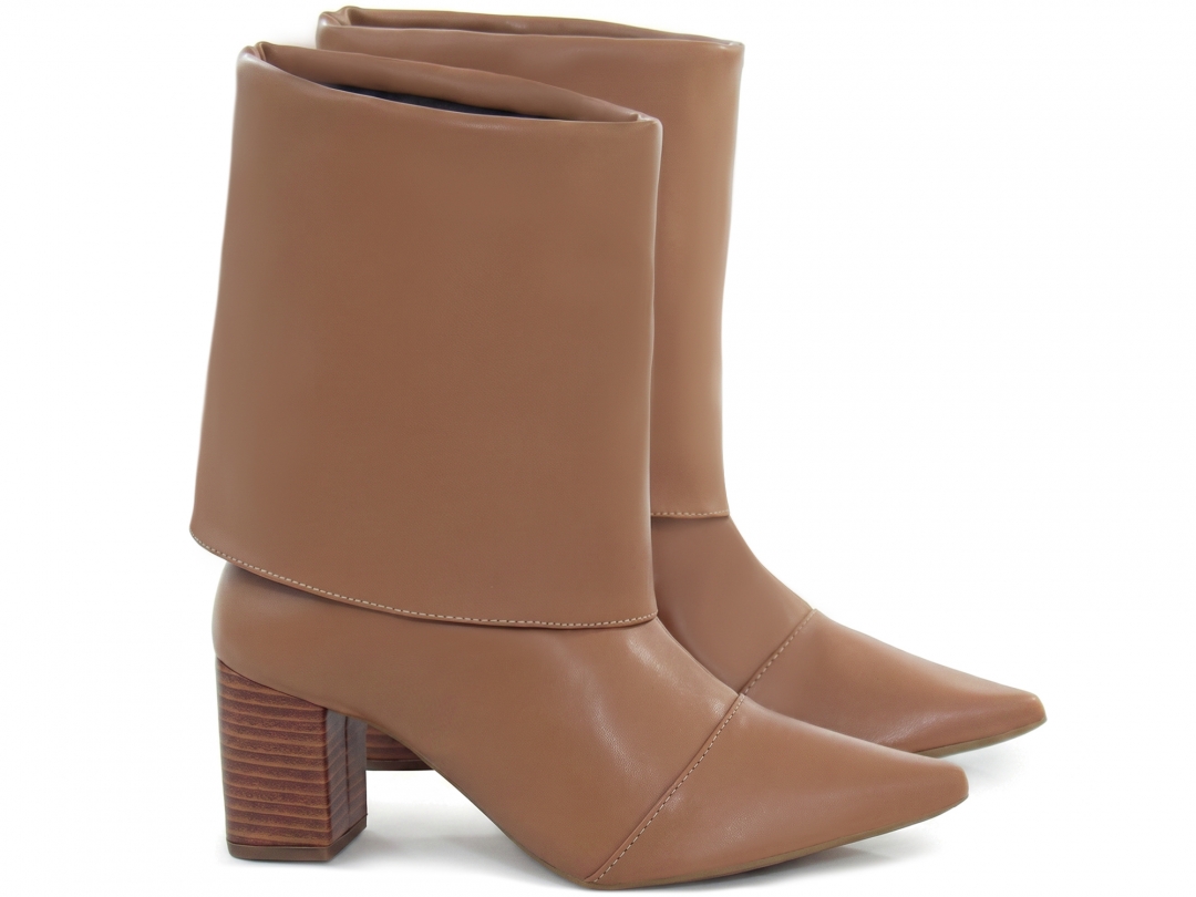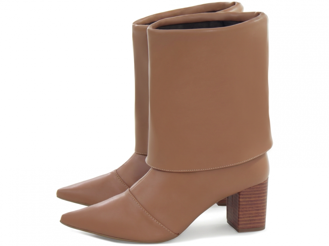Enfeites: Zíper na cor Caramelo (lateral interna) e material com vira no cano em Napa Marrom Caramelo (não removível);